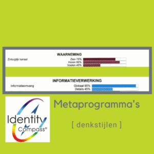 Denken doet iedereen, maar de wijze waarop iemand denkt, blijkt zeer verschillend te zijn. Wij zijn er trots op een testprogramma te kunnen bieden dat inzicht geeft in metaprogramma’s. Metaprogramma’s zijn denkstijlen of leerstijlen met bijhorend gedrag. Het meetinstrument dat wij gebruiken is de Identity Compass®.